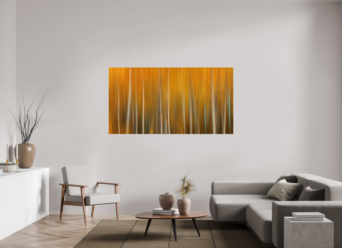 This artistic photograph depicts an autumnal forest in Wyoming, captured with vertical motion blur. The slender tree trunks—presumably birch or aspen—form a rhythmic pattern in warm hues of orange and gold. The blur creates a painterly composition that seamlessly blends nature and abstraction. An image that exudes tranquility, color, and movement.