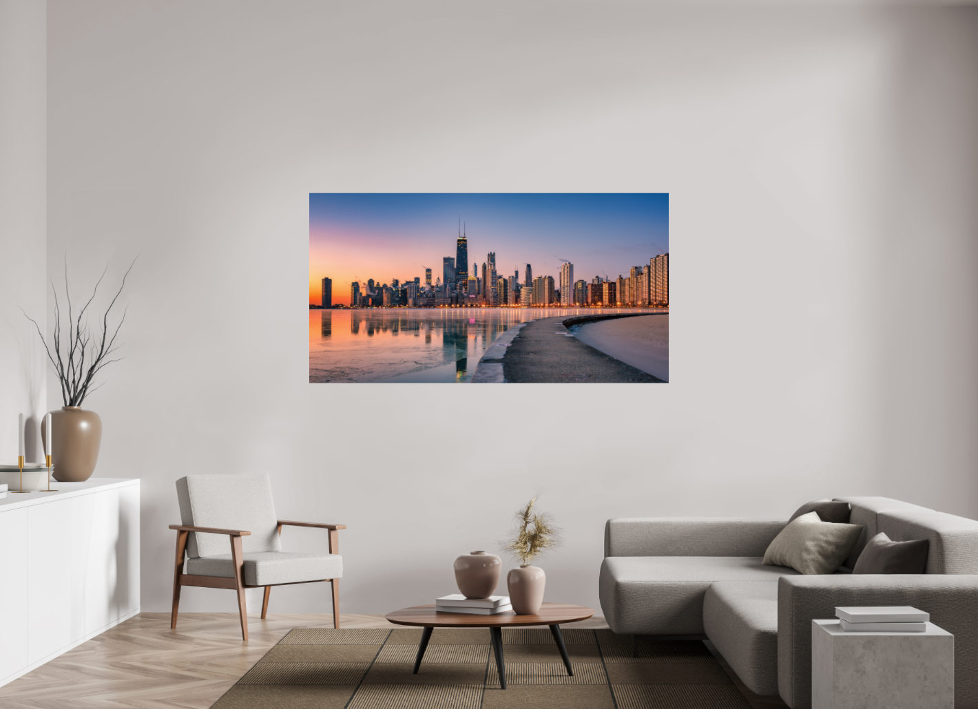 Deze sfeervolle foto toont de skyline van Chicago in het warme licht van zonsopkomst, gezien vanaf een gebogen wandelpad langs Lake Michigan. De kalme, deels bevroren wateroppervlakte weerspiegelt de kleuren van de lucht en de stad, met de John Hancock Center als herkenbaar silhouet. Een serene combinatie van natuur en architectuur – perfect voor moderne interieurs.