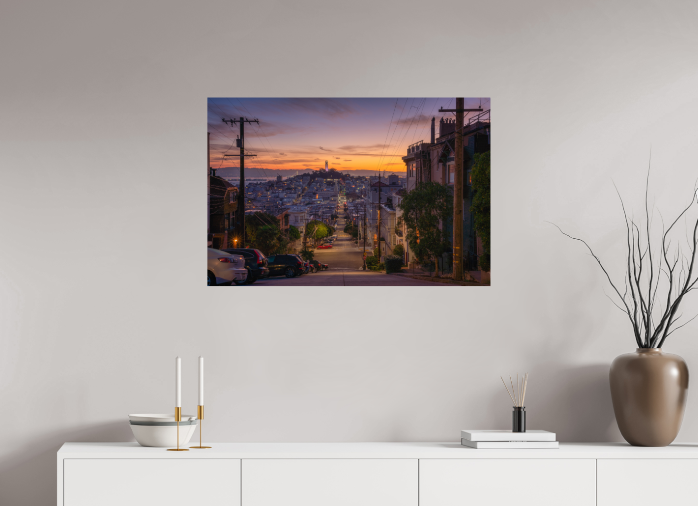 Een sfeervol straatbeeld in San Francisco, gezien vanaf een heuvel met uitzicht op Coit Tower. De lucht kleurt in warme tinten van oranje en paars, terwijl de stad zich uitstrekt richting de baai. Een beeld vol karakter, topografie en licht.