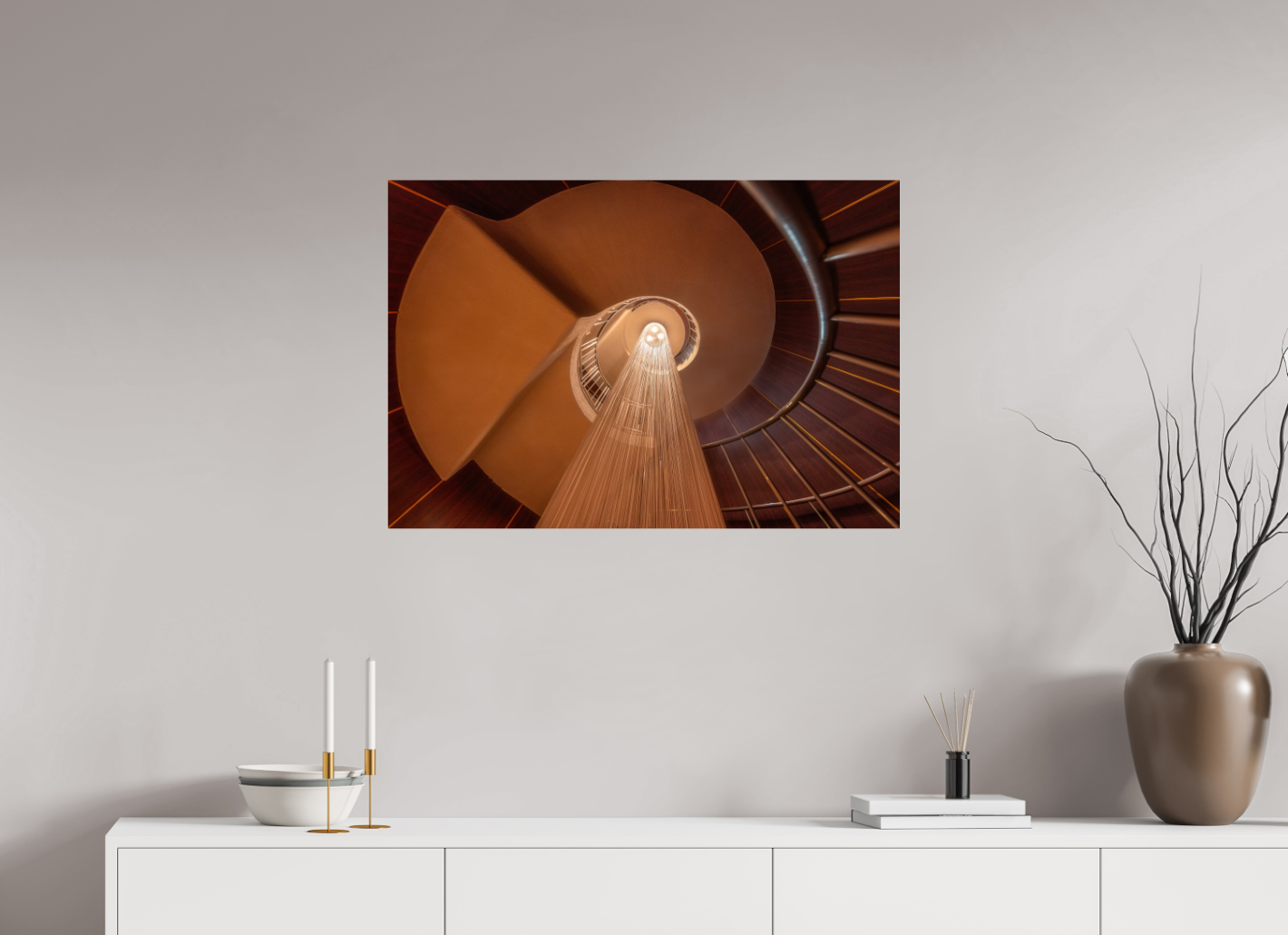 Deze stijlvolle foto toont een spiraaltrap in Osaka, gezien van onderaf, met een indrukwekkende hangende lichtinstallatie die als een fonkelende waterval door het midden valt. De donkere houten treden en metalen leuning contrasteren prachtig met het warme plafond. Een architectonisch hoogstandje dat rust, ritme en elegantie uitstraalt – perfect voor moderne interieurs en designliefhebbers.